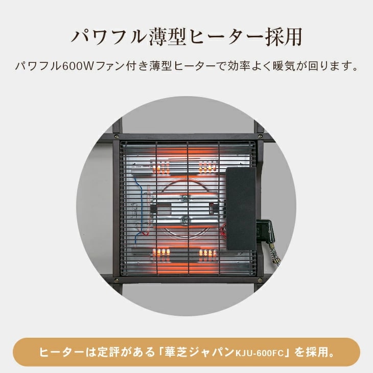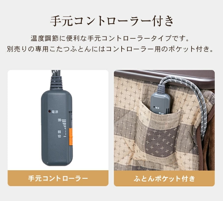 ●仕様/テーブル:ヒーター電源:AC100V(50/60Hz)、消費電力:600W、ヒーター定格電圧:交流100V、ヒーター発熱体:石英管ヒーター300W×2本、ヒーターコード:2.8m(手元コントローラー付き)、ヒーター温度調節方式:無段階調節ファン付き(華芝ジャパンKJU-600FC)、ふとん:両面リバーシブル(フランネル面:はっ水加工)