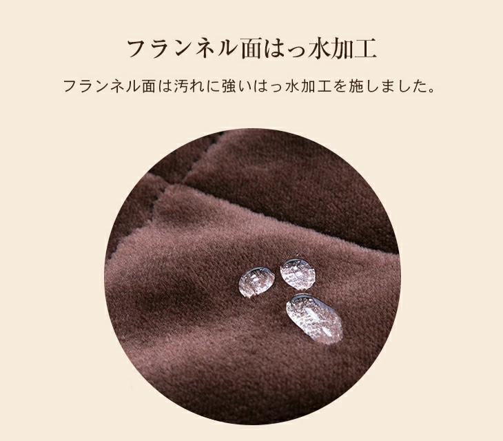 落ち着きのあるしじら織りの格子柄面と撥水加工のフランネル面と、両面つかえるリバーシブルこたつ布団です。両面ともに温度調節のコントローラーが収納できるポケット付き。布団のコーナー部分にはマチがついているので、熱を逃しにくい仕様になっています。