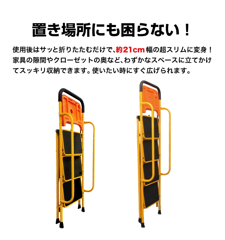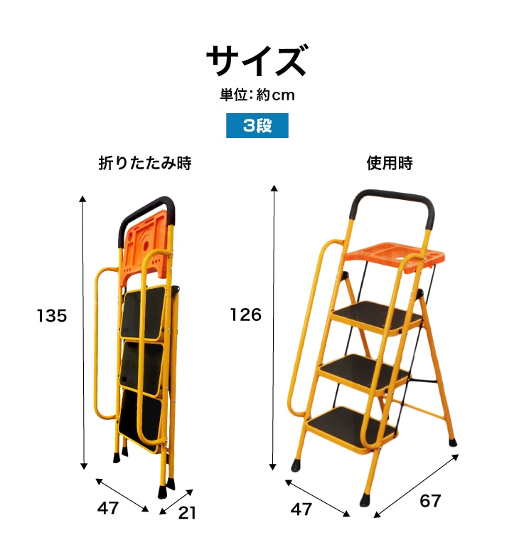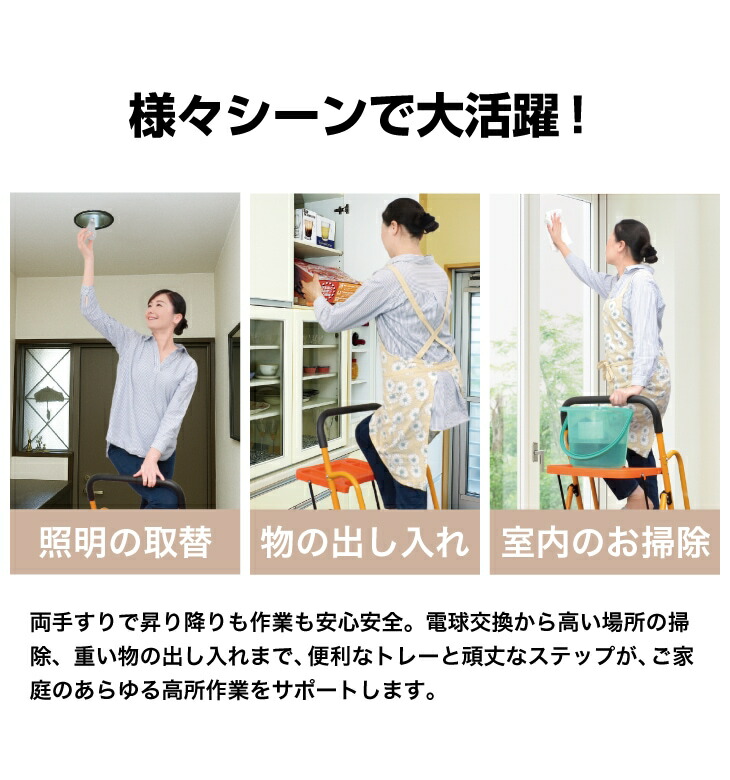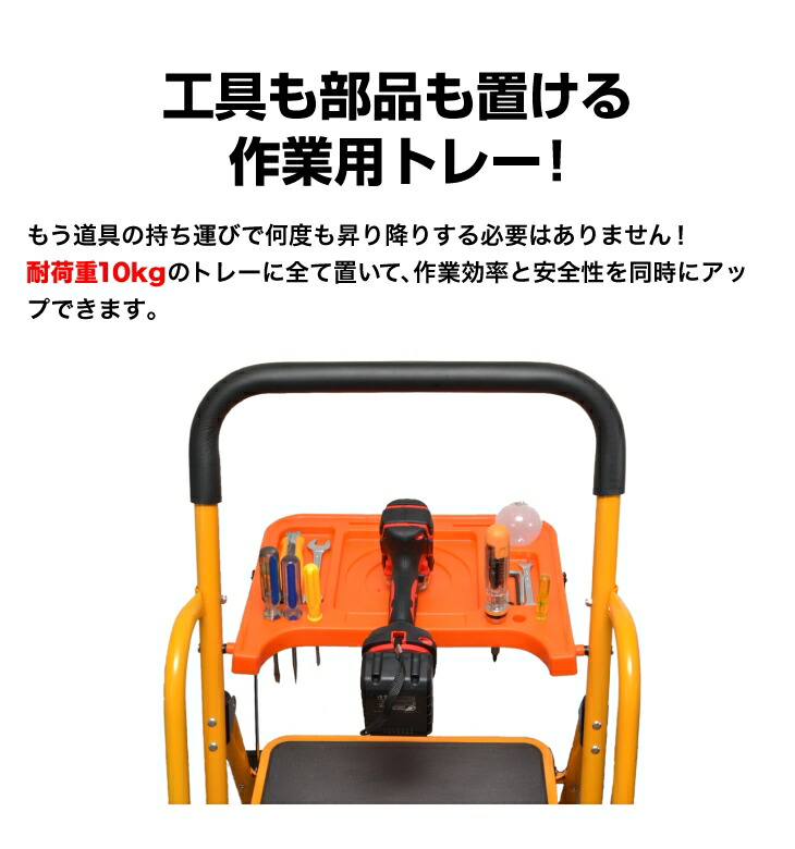 昇り降りが不安な作業も、両手すり付きで安心!踏み台部分は耐荷重約100kgで頑丈です。工具や塗料が置ける便利なトレー(耐荷重約10kg)も付いて、高所作業がはかどります。使用しない時はサッと折りたたんでコンパクトに収納可能。使いたい時に広げるだけで、すぐに使える便利な脚立です。
