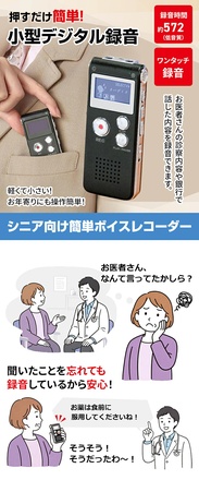 オレオレ詐欺対策に!物忘れ対策におすすめ!押すだけ簡単、お年寄りにも操作が簡単なシニア向けボイスレコーダーです。かかりつけのお医者さんの診察内容や銀行で話した内容など、忘れたくない事や何度も繰り返して聞きたい事を簡単に録音・再生します。付属のピンマイクを使えば固定電話の録音も可能です。サッと取り出せるのでメモ代わりにも活用いただけます。