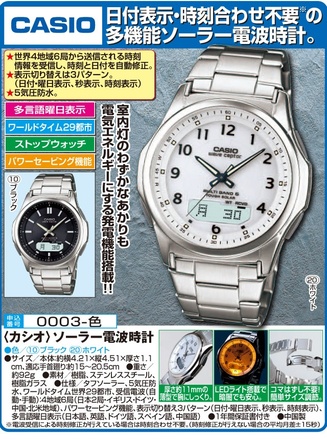 ●仕様/タフソーラー、5気圧防水、ワールドタイム世界29都市、受信電波(自動・手動):4地域6局(日本2局・イギリス・ドイツ・中国・北米地域)、パワーセービング機能、表示切り替え3パターン(日付・曜日表示、秒表示、時刻表示)、多言語曜日表示(日本語、英語、ドイツ語、スペイン語、中国語)