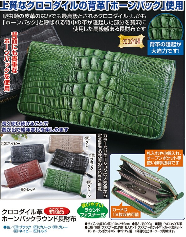 爬虫類の皮革のなかでも最高級とされるクロコダイル。しかも「ホーンバック」と呼ばれる背中の革が隆起した部分を贅沢に使用した高級感ある長財布です。