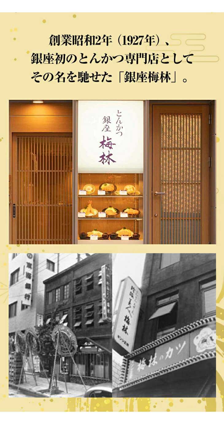 昭和2年創業、銀座で初めてのとんかつ専門店「銀座梅林」監修。「ひと口カツ」や、とんかつに合った「中濃ソース」を考案するなど、とんかつのパイオニア的存在の名店。
