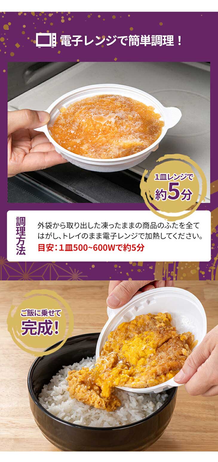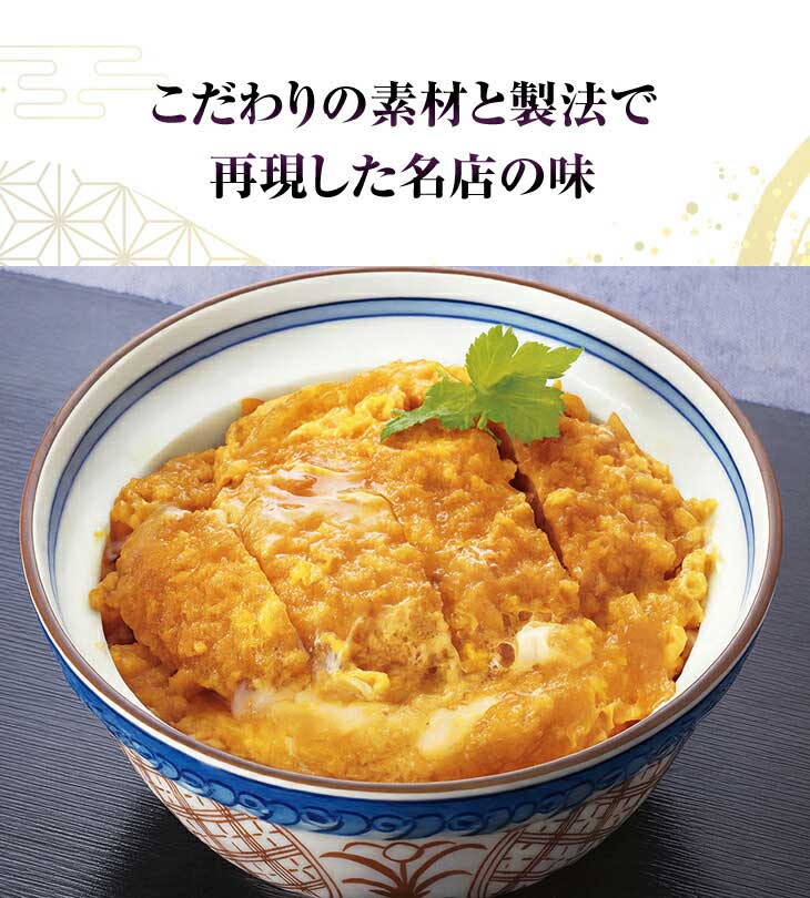 | 原材料/素材/材質 | とんかつ{豚肉、衣(パン粉、でん粉、食用油脂、小麦粉、米粉)、食塩、粉末小麦発酵調味料、砂糖}(国内製造)、鶏卵(国産)、卵とじ(鶏卵、卵白、発酵調味料、白しょうゆ、液体風味調味料、風味調味料)、たまねぎ(国産)、しょうゆ、砂糖、揚げ油(大豆油)、みりん、還元でん粉糖化物、鰹節調味エキス、コラーゲン/加工でん粉、調味料(有機酸等)、増粘剤(キサンタンガム)、カロチン色素、甘味料(カンゾウ)、(一部に小麦・卵・乳成分・さば・大豆・豚肉・ゼラチンを含む) |