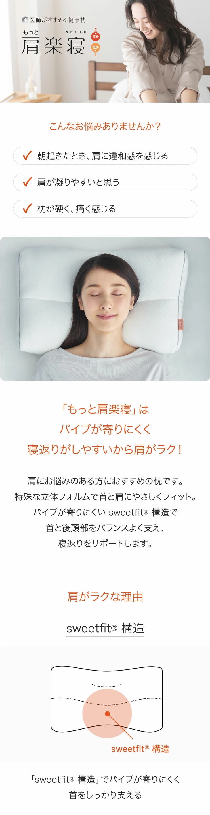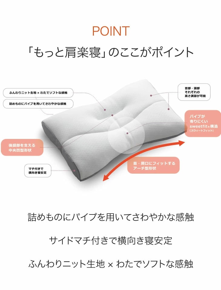 朝起きたとき、肩に違和感を感じる、肩が凝りやすい、枕が硬く、痛く感じる等、お悩みの方におすすめの快眠枕。