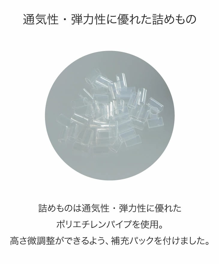 詰めものは通気性・弾力性に優れたポリエチレンパイプを使用。高さ微調整ができるよう、補充パックを付けました。