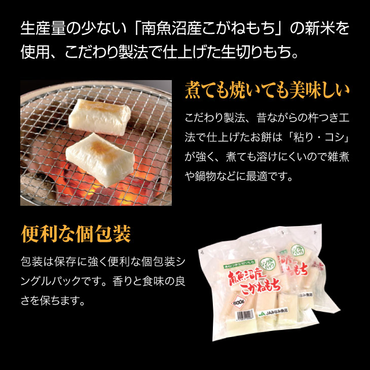 生産量の少ない「南魚沼産こがねもち」の新米(もち米)を使用し、昔ながらの杵つき工法でつき上げた大変希少な生切りもちです。こだわり製法で仕上げたお餅は「粘り・コシ」が強く煮ても溶けにくいので雑煮や鍋物などに最適です。包装は保存に強く便利な個包装です。