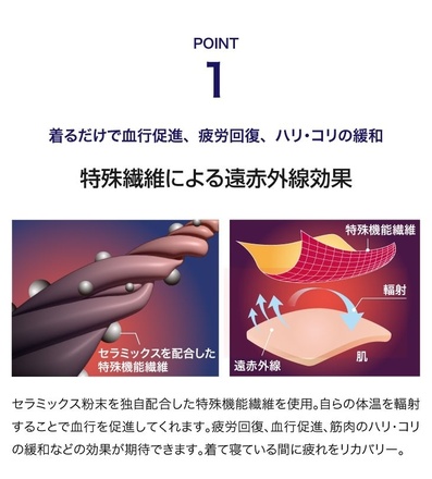セラミックス粉末を独自に配合した特殊機能繊維を使用。自らの体温を輻射することで血行が促進され体の疲労やコリを軽減します。