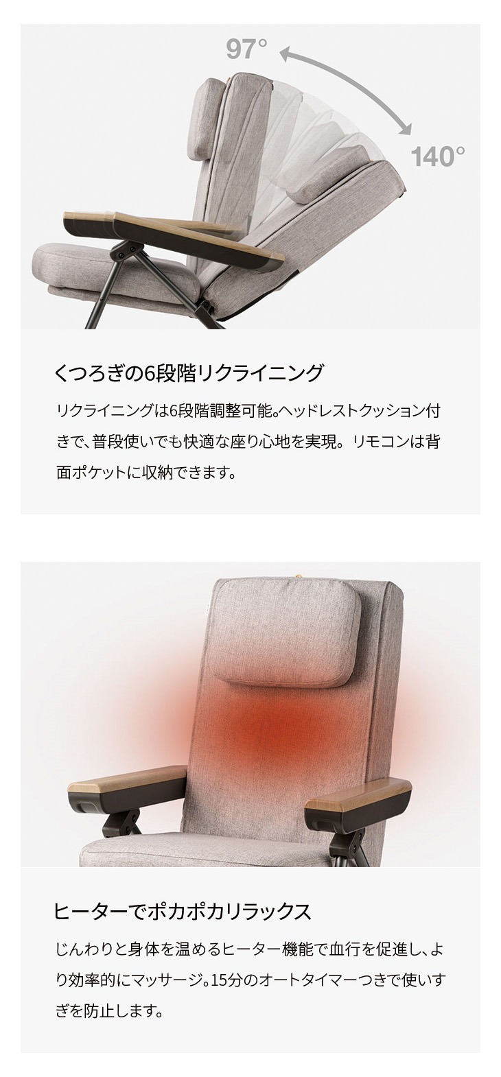 デザイン性と実用性機能を備えたデザインチェアにはマッサージ機能とヒーターが搭載。