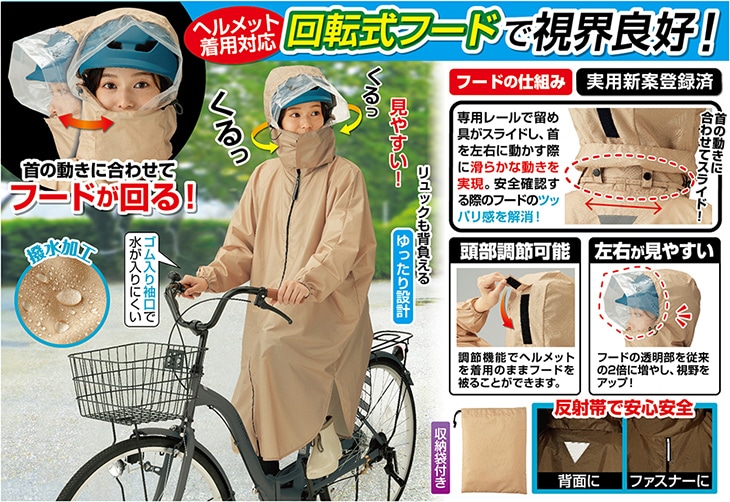 1.首に合わせてフードが回転し視界良好: 独自の回転式フードが、首の動きに合わせてスライドするため、ツッパリ感がなく、横を向いた時の視界を遮りません。透明部も大きく、雨の日でも安全確認がしやすい設計です。