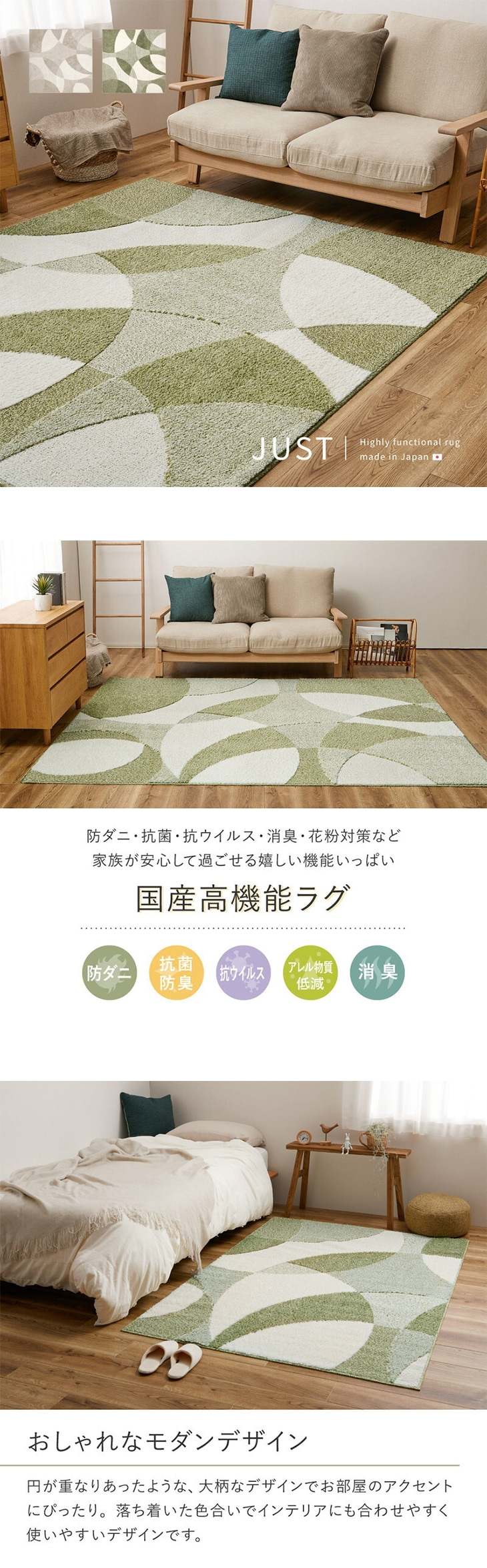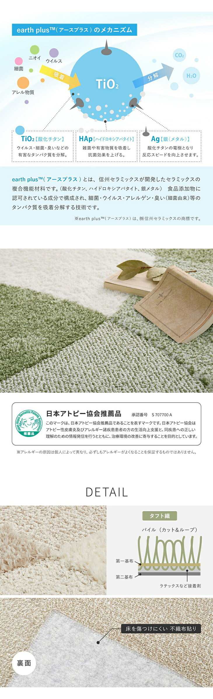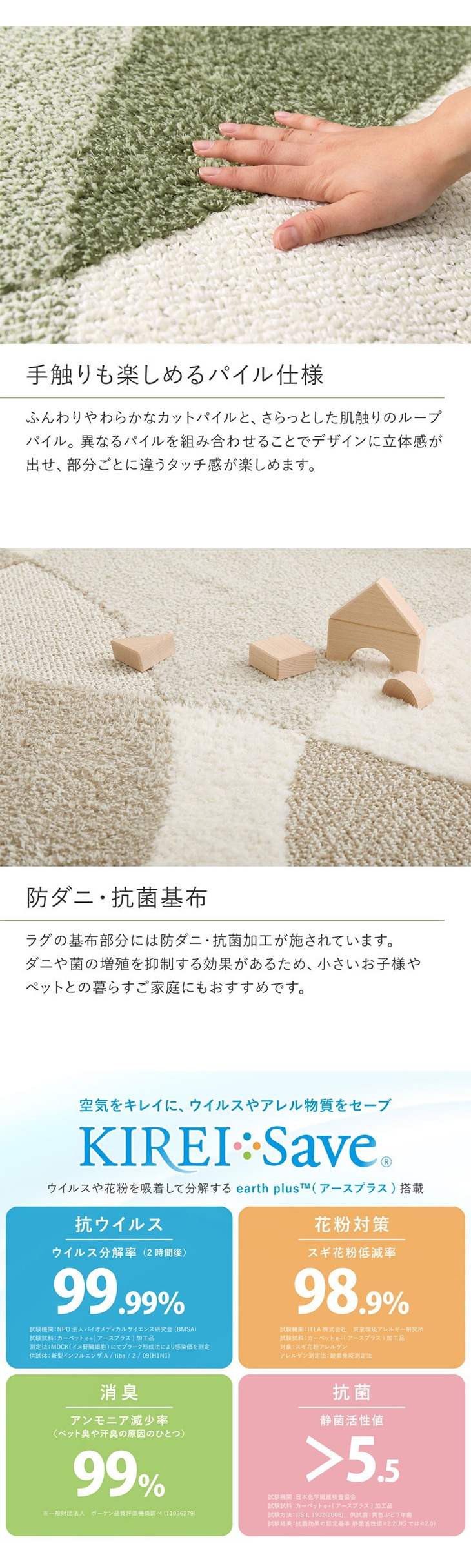 1.安心機能5つで家族を守る: 防ダニ・抗菌防臭・抗ウイルス・消臭・アレル物質低減の5つの機能が一つに。日々の生活の中で気になる菌やニオイ、花粉対策までをこのラグ一枚でサポートします。
