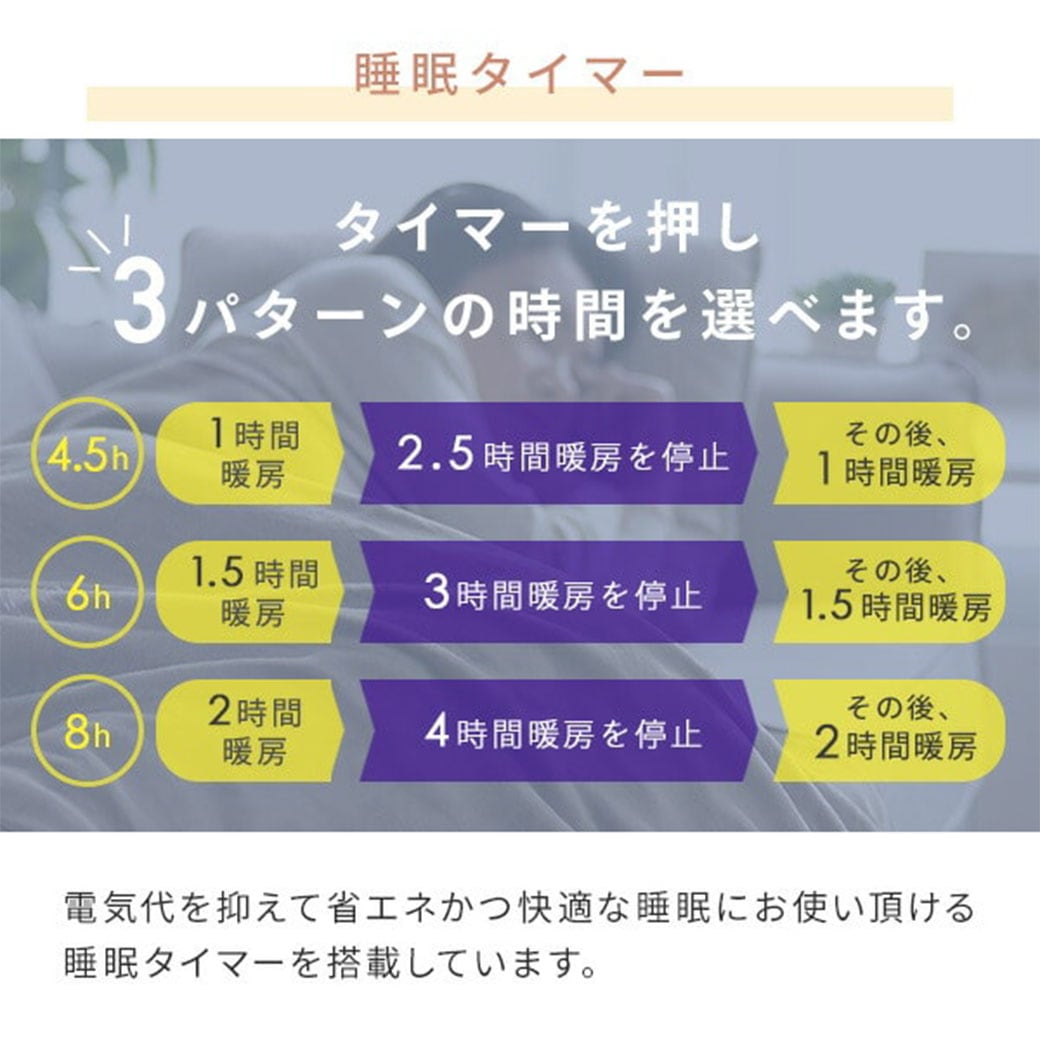 新発想の高効率3Dキルト採用!体にフィットする電気掛毛布です。暖かさを逃がさない特殊な3Dキルトと、冷えやすい足元を暖める頭寒足熱配線でぐっすり眠れます。横寝や寝返りの多い方にも最適!また、ダニ対策機能付きでいつでも清潔。電気代は強で使用の場合1時間あたり約1.1円と経済的です。肌触りの良いフランネル生地と中綿入りで、包み込まれるような温かさ。足元までぽっかぽか♪2種類のタイマー付きで便利!切り忘れ防止の12時間タイマーに加え、省エネ睡眠タイマーを搭載。入眠(ON)→就寝時(自動OFF)→起床時(自動ON)と自動で温度をコントロール(4.5時間・6間の設定OK)。室温センサー搭載で、朝方の冷え込みも自動でキャッチし快適です。手元のコントローラーで温度調節も可能です。