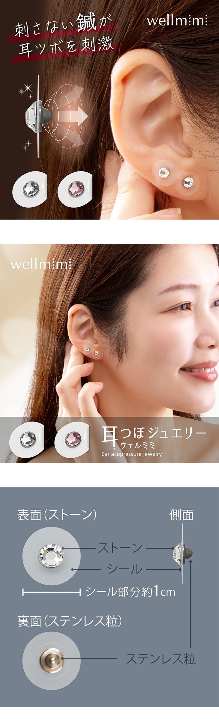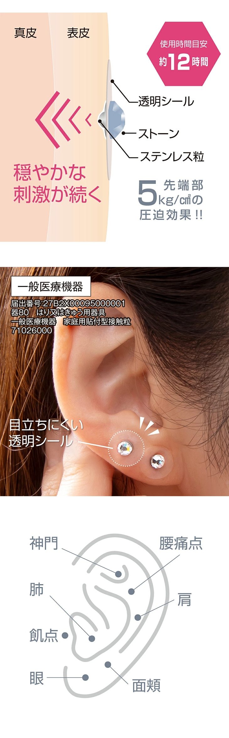 ピアスのように見えるシールでおしゃれを楽しみつつ、ステンレス粒でツボを刺激し、体調改善を目指します。
