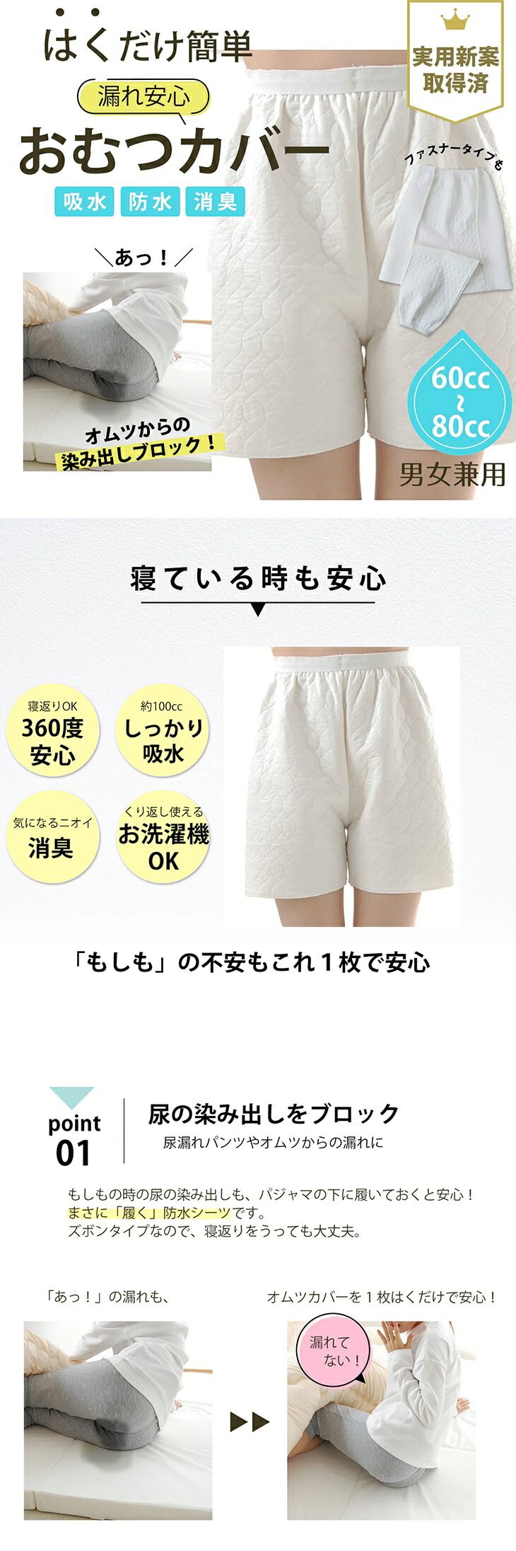 おむつカバー すいとるオムツコート ファスナー付き 男女兼用 日本製 漏れ防止 介助 介護 寝たまま脱着 60cc吸水 ポリウレタン樹脂 失禁対策 ホワイト
