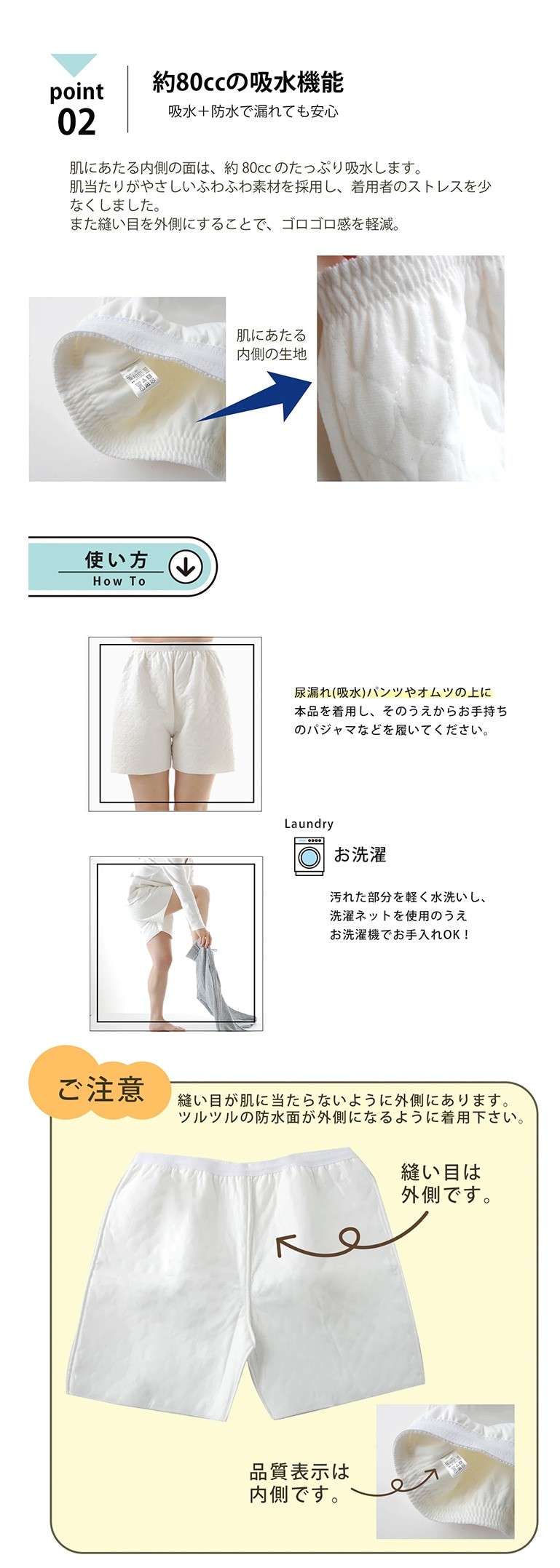 表側にはポリウレタン樹脂、中側には吸水性に優れた混合素材を採用。約60ccの給水量を備えており、おむつからの予期せぬモレをしっかりキャッチします。シーツや寝具を汚す不安を和らげ、ご本人も介助者も心穏やかな夜を過ごせます。確かな品質の日本製で、毎日のケアをより優しく、よりスマートにサポートします。