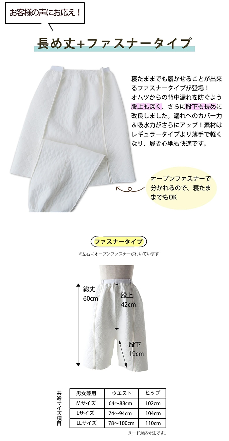 ファスナーは、横向きに寝ても体が当たって痛くならないよう、あえて「真上(太もも正面付近)」に設計されています。これにより、就寝時の違和感を最小限に抑えつつ、介助者がサッと開閉できる機能性を両立。男女兼用で使えるシンプルなホワイトカラーは、下着感覚で日常に馴染みます。