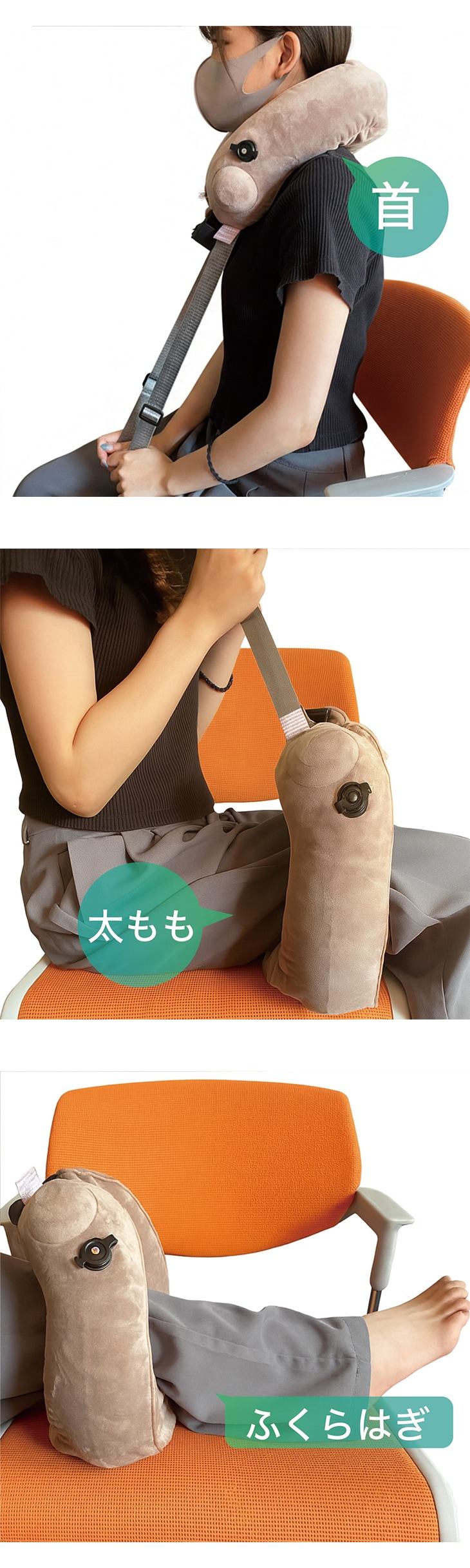 最大の特長は、特許取得のビルトインエアポンプ。手動で簡単に膨らませることができ、使わない時は空気を抜いて手のひらサイズに収納可能です。重さわずか約630gと軽量で、キャリーバッグも付属。充電式コードレス仕様なので、自宅のリビングだけでなく、新幹線や飛行機での長距離移動にも最適です。