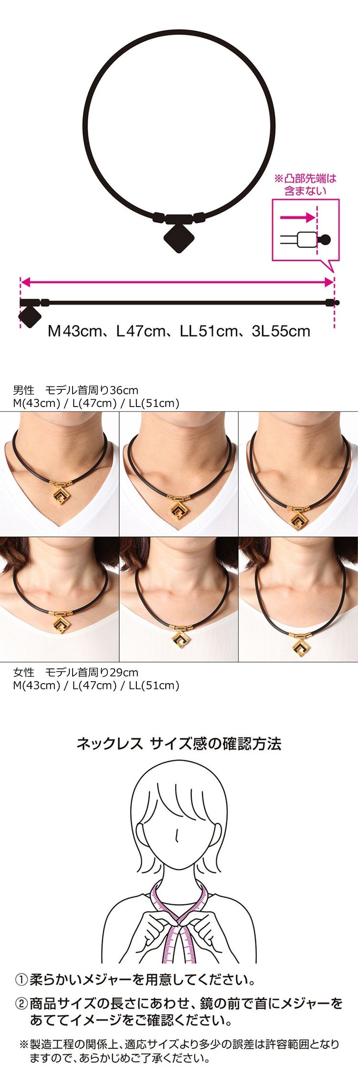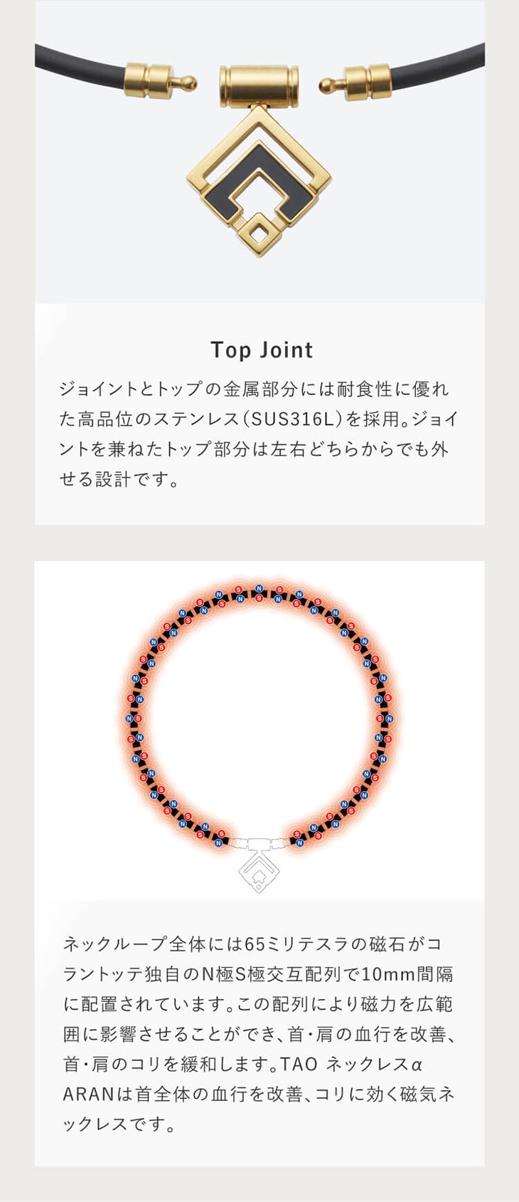 ●素材/ネックループ部分:樹脂コーティング磁石(65mTを10mm間隔でN極S極交互配列)、ジョイント:SUS316L、ジョイント内部:POM