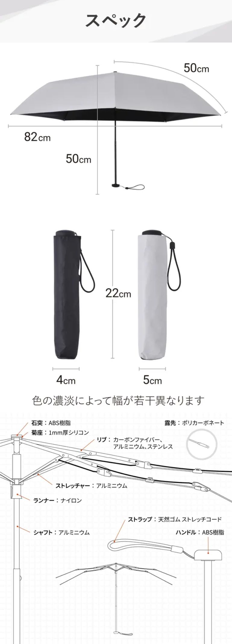 | サイズ/寸法 | 【使用時サイズ】 ●親骨長さ: 50cm ●骨数: 5本 ●直径: 約82cm ●全長: 50cm 手開き式 【収納時サイズ・重量】 ●高さ: 22cm ●幅: 濃色系約4cm、淡色系約5cm |