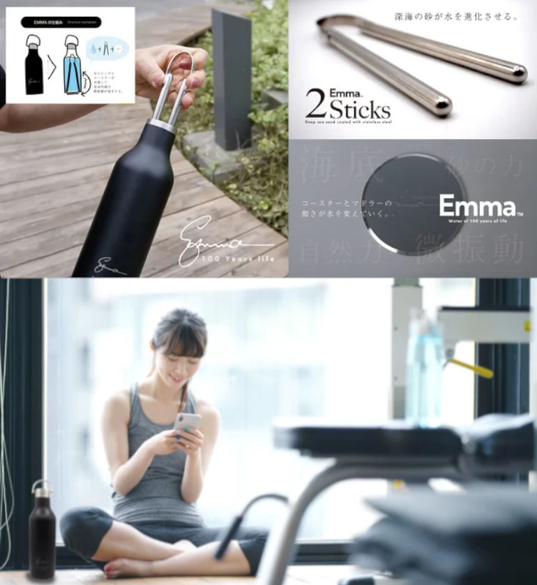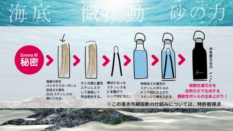 Emmaは、海底の神秘の砂のエネルギーに着目。バイオマスカーボンを利用し、普通の水を機能水に変えられるボトルの開発に成功しました。