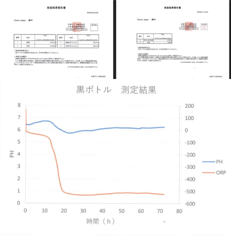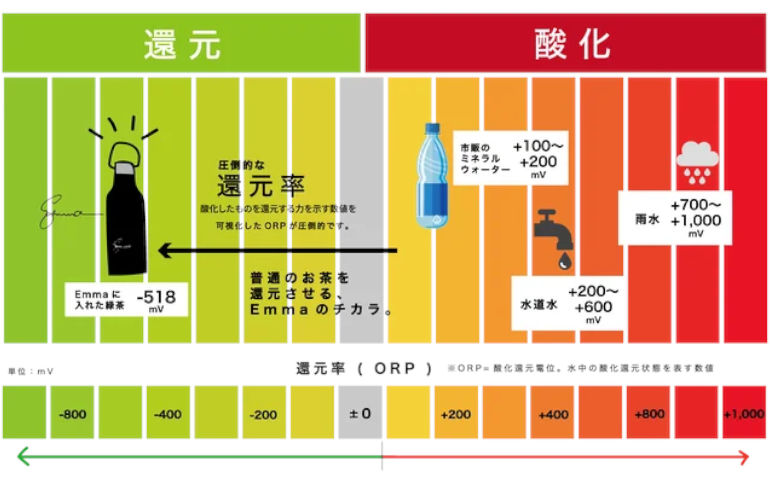 一般的にこの値においては、+40~-500が体に良い水とされています。各ミネラルウォーターによって還元率は異なりますが、Emmaは、+50~-520まで還元が試験の結果計測されました。