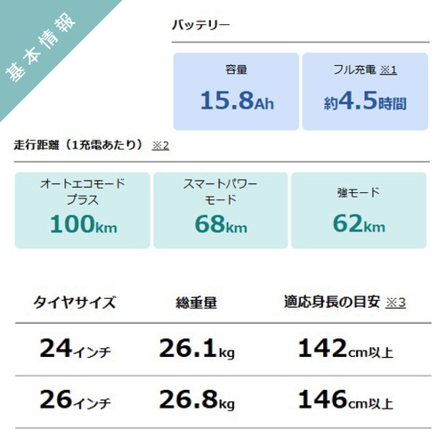 | その他詳細 3 | 走行距離: 強モード 約62km スマートパワーモード 約68km オートエコモードプラス 約100km |