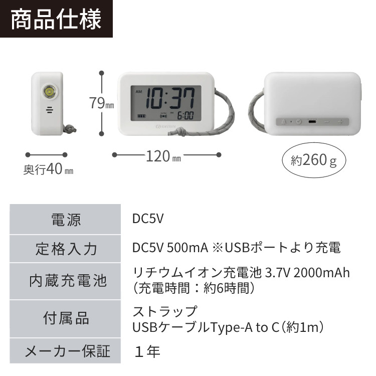 | その他詳細 1 | サイズ・重さ 79×120×40mm/約260g(ケーブル含まず) 配色 08 ライトグレー 材質 プラスチック枠 防塵・防水機能 IP44相当 明るさ切替 3段階(強/中/弱)+OFF 明るさ(光束) ランタン:強16lm /中8lm /弱2lm 懐中電灯:強50lm/中25lm /弱5lm 連続使用時間(充電池使用時) ランタン:強15時間 / 中24時間 / 弱72時間 懐中電灯:強9時間 / 中15時間 / 弱48時間 液晶部バックライト:強48時間 / 中360時間 / 弱720時間 時計表示:約1年間 |