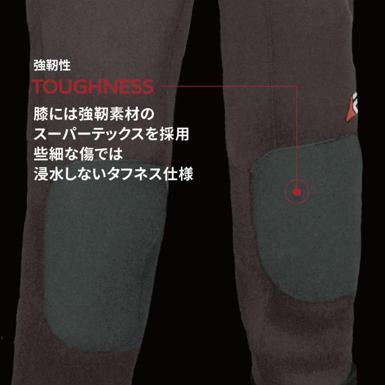 | その他詳細 2 | ● 強靭素材の採用で高い防水性 擦れに強いスーパーテックスを使用することで、些細な傷では浸水しないタフな仕様です。 ● ネオプレン素材と解剖学による柔軟性 4mmのネオプレンナイロンジャージを表地に使用しています。 合わせて「解剖学的裁断技術A.C.T.」により、高度な柔軟性を実現しました。 |
