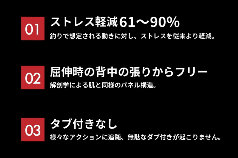 | その他詳細 4 | 【ストレスを軽減する。解剖学的裁断技術「A.C.T.」】 体の表面を覆う皮膚は一枚の皮ではありません。 身体の動きやそれに伴う伸び縮みに応じて部位ごとに区分された皮膚が、適度なゆとりを持たせた状態でつなぎ合わさり、身体を保護しています。 全身にまとう皮膚に、私たちが窮屈を感じないのはそのためです。 Rearthでは、当社がダイビングやサーフィンスーツで培った独自技術「解剖学的裁断技術=A.C.T.」を採用。 「A.C.T.」により製作されたスーツは、想定される動きに対しストレスを従来より61~90%軽減します。 釣りにおける様々なシーンでストレスを軽減し、ムダなだぶつきがなく屈伸しても背中のツッパリ感はまったく感じません。 |