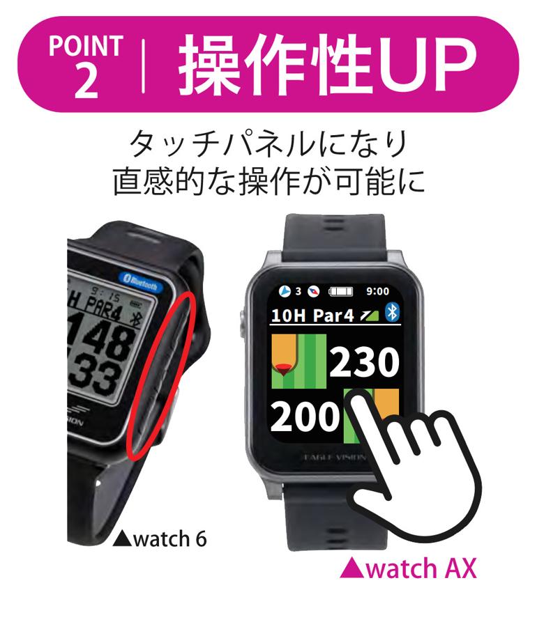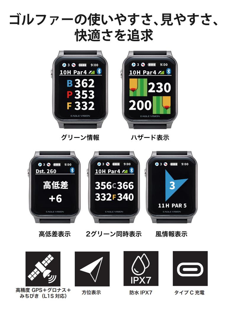 | その他詳細 1 | 圧倒的なシンプルさと使いやすさで老若男女、多くのゴルファーに受け入れられてきた watchシリーズから新たなアイテムが登場 【ポイント1】 視認性UP 外でも見やすいカラーディスプレイを採用。 画面サイズも1.69インチと大きくなり、残り距離やハザード情報などすべての表示がより見やすくなりました。 【ポイント2】 操作性UP タッチパネルを採用することにより、スワイプとタッチの直感的な操作でより快適にプレーすることができるようになりました。 【ポイント3】 持続性UP バッテリー使用時間が約16時間と前作よりも大幅にUP。長時間のラウンドでもさらに安心して使えるようになりました。 |