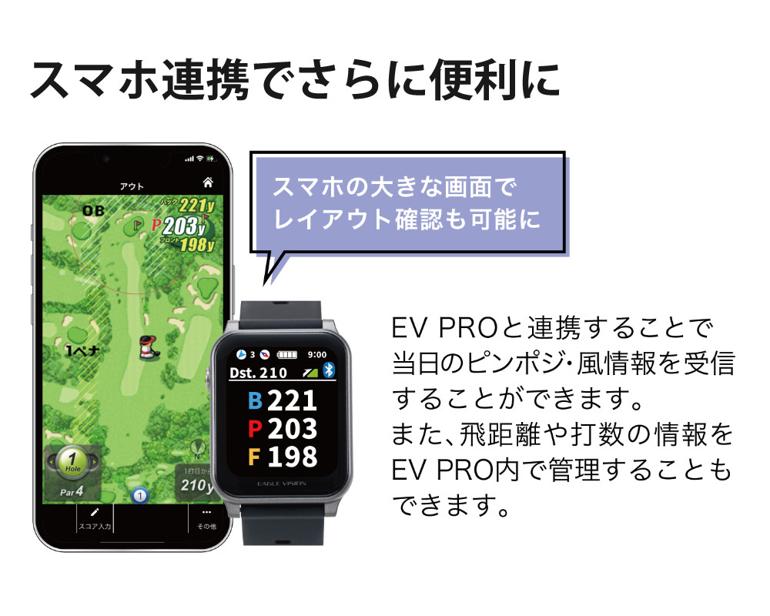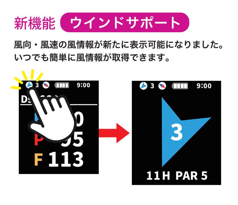 | その他詳細 2 | ●ベタピンナビ ショット地点にあったグリーンまでの距離と形状を表示するベタピンナビがカラーになったことでさらに見やすく、便利になりました。 ●風情報表示 スマホアプリ「EV PRO」との連携で、当日の風向・風速を表示します。ゴルフにとって重要な風情報を常に意識することで、より戦略的にプレーすることができます。 ●でか文字表示 グリーンのフロントエッジとピンまでの距離(ピンポジ君未設定時はセンター)のみを大きく表示。 よりシンプルにグリーンの残り距離だけを知りたいという方にお勧めです。 ●2グリーン同時表示 左右にある2つのグリーン情報を、1つの画面に同時に表示。左右の切替操作も不要です。 |