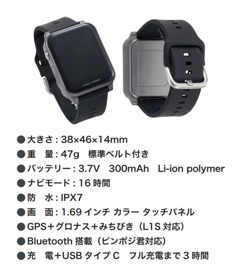 | その他詳細 5 | 【仕様】 GPS仕様:GPS/GLONASS(グロナス)/MSAS/QZSS(みちびき)L1S信号対応 通信仕様:Bluetooth(R) SMART スマホアプリ連携:◯ ディスプレイ:1.69 インチ カラー タッチパネル 防水仕様:IPX7 ベルトのサイズ:適応サイズ ・初期装着のサイズ:13~18cm ・予備ベルトに交換した場合:16~21cm ※初期装着のベルトでは小さい場合、予備ベルトに取り替えてご使用ください。 電源:Li-ion電池(USB Type-Cから充電) 使用時間:ゴルフモード 約16時間/時計モード 約40時間 動作温度範囲:0~40℃ 充電温度範囲:0~40℃ |