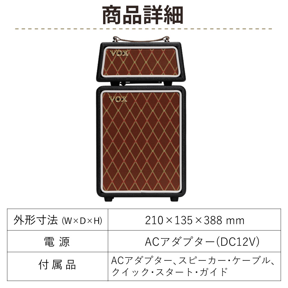 | その他詳細 2 | コントロール:VOLUME、REVERB、BASS、TREBLE、GAIN、Bluetoothボタン、POWERボタン 出力パワー:最大20W(アンプヘッド+キャビネット使用時)|最大5W(アンプヘッド単体使用時) スピーカー:アンプヘッド部:1×1.5インチ 4Ω VOXオリジナルスピーカー キャビネット部:1 × 4インチ 8Ω VOXオリジナルウーファー 電源:ACアダプター(DC 12V)+充電式バッテリー駆動(単体使用時) バッテリー持続時間:約4時間(使用条件により変動) 入出力端子 ヘッド部:INPUT(6.3mmモノラル)、AUX/PHONES(3.5mmステレオ)、SPEAKER OUTPUT(6.3mmTS) キャビネット部:SPEAKER IN(6.3mmモノラル) |