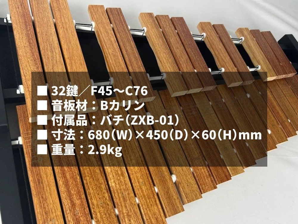 | その他詳細 2 | 音域:32音/F45~C76 音板材:ブラジルカリン 音板仕上:ウレタン塗装 脚部 樺材:ウレタン塗装 |