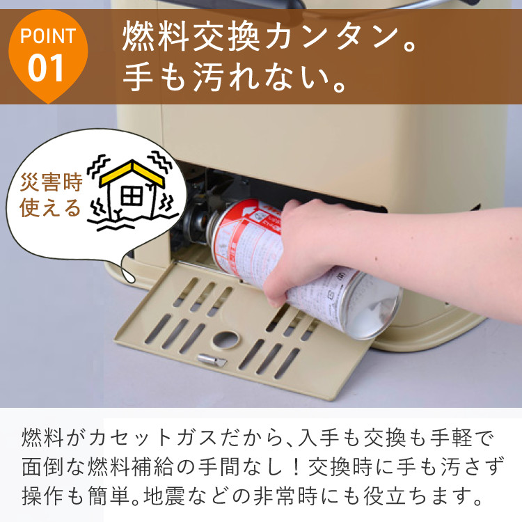 カセットボンベ を燃料とし、ポータブルのメリットを生かし、家中どこでも持ち運べる手軽さが魅力です。