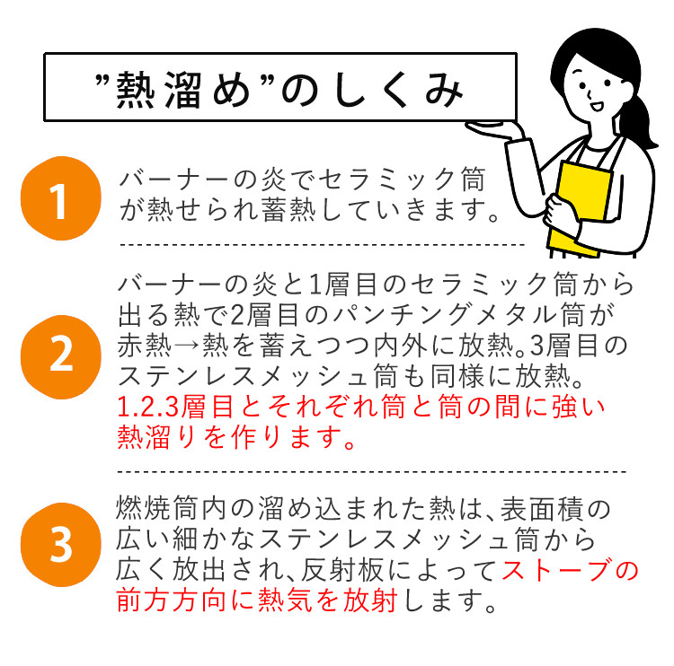 【熱溜め燃焼筒】と【ステンレス反射板】によって前面広角に暖を輻射します。