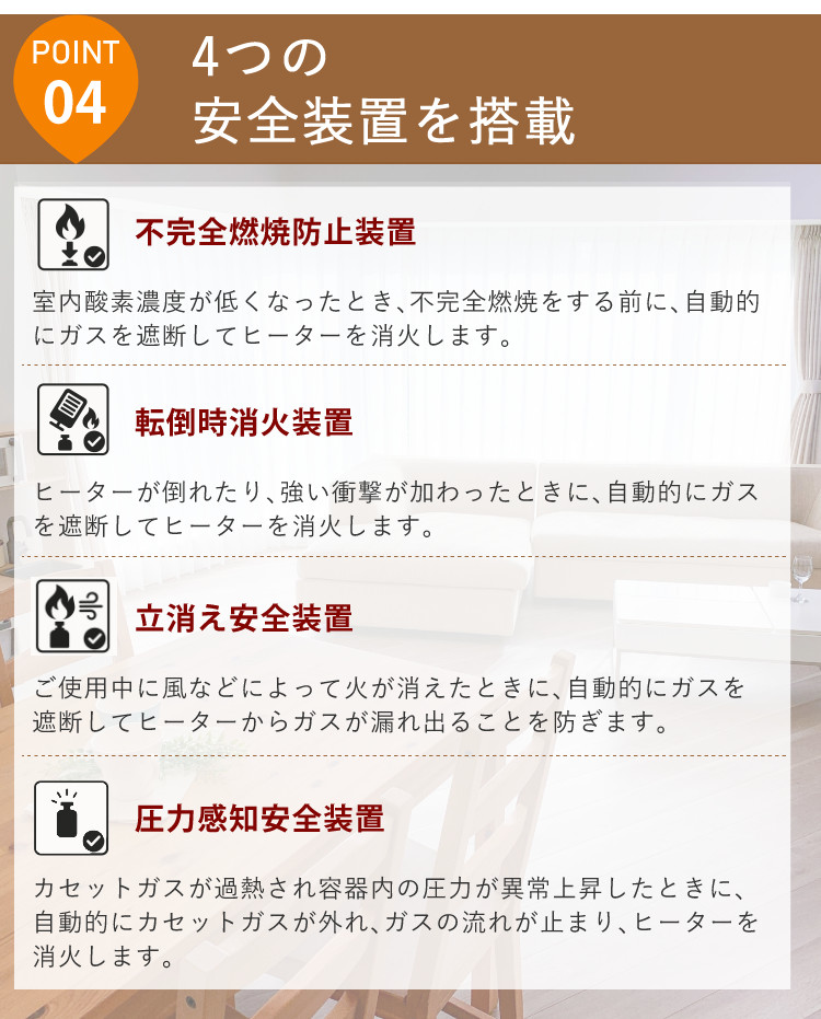 室内酸素濃度が低くなったとき、不完全燃焼をする前に、自動的にガスを遮断してヒーターを消火します。
