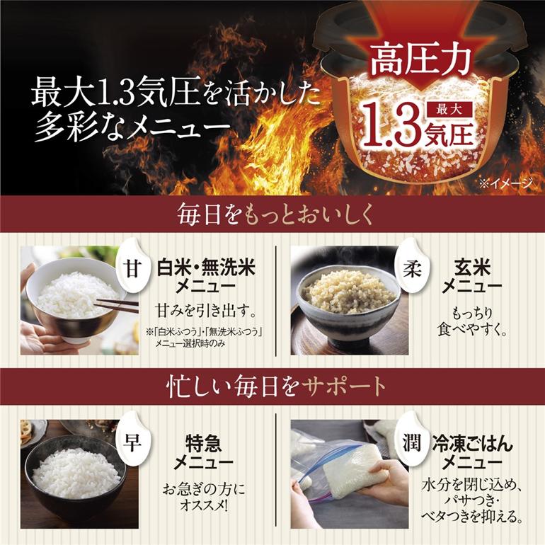 圧力の強さと圧力をかける時間を調整して、すしめし、しゃっきりからもちもち、玄米までメニューにあわせて圧力と時間を変えて7通りの食感に炊き分けます。皮の固い玄米も1.3気圧の高圧力をかけることでふっくらやわらかく炊き上がります。(白米の炊き分けは5通りの炊き分け、しゃっきり・ややしゃっきり・ふつう・ややもちもち・もちもちです。)