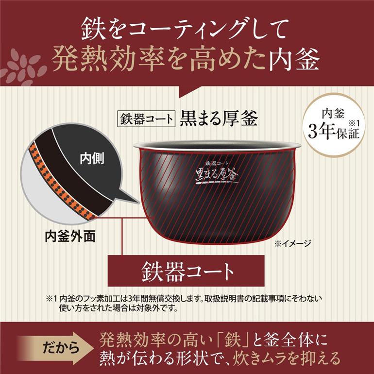 豪熱大火力により沸とう維持工程で強い対流を起こし お米のアルファ化を促進して甘みを引き出し 芯までふっくら炊き上げます 鉄器コート黒まる厚釜は外面に鉄をコーティングし 釜全体に熱を伝えて炊きムラを抑えます 49通りのわが家炊きメニューは前回の食感の感想をもとに炊き方を調整し 銘柄や新米 古米にかかわらず好みに近づけます 大火力ユニットは泡を分離してふきこぼれを抑制し 大火力炊飯を可能にします 圧力と時間を調整する7通りの炊き分け圧力や 雑穀米3コース 冷凍ごはんメニュー 特急メニューにも対応 うるつや保温は最長30時間保温できます 内ぶたは食器洗い乾燥機対応で 手入れも簡単です