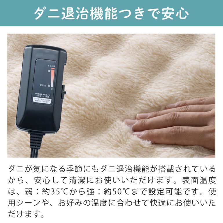 | その他詳細 1 | 電源:AC100V 50/60Hz 消費電力:55W 材質:本体毛布部分:ポリエステル/コントローラー:ABS 温度設定:無段階調節 主な機能:ダニ退治 表面温度(目安):弱:約35±5度~強:約50±5度 |