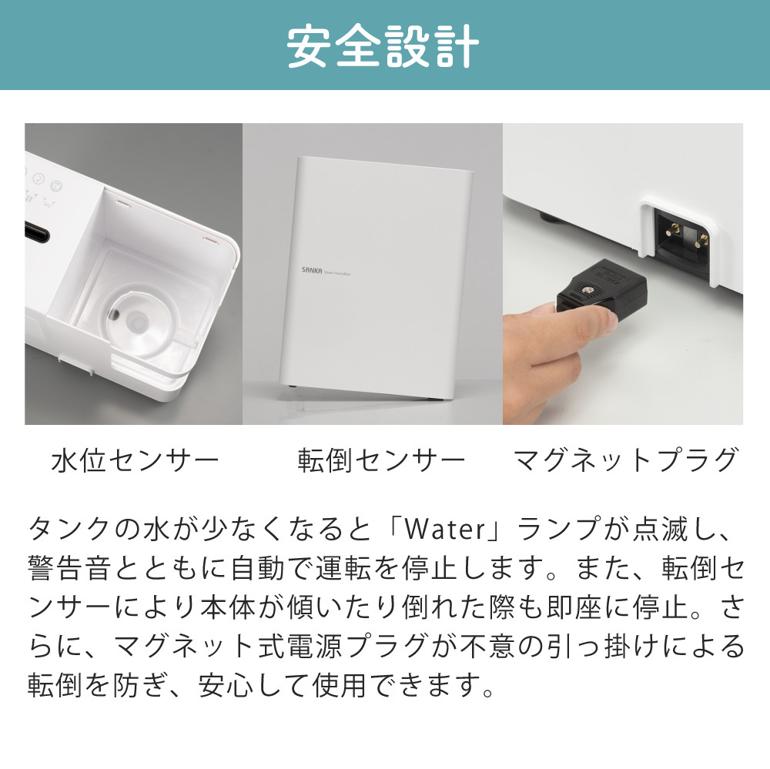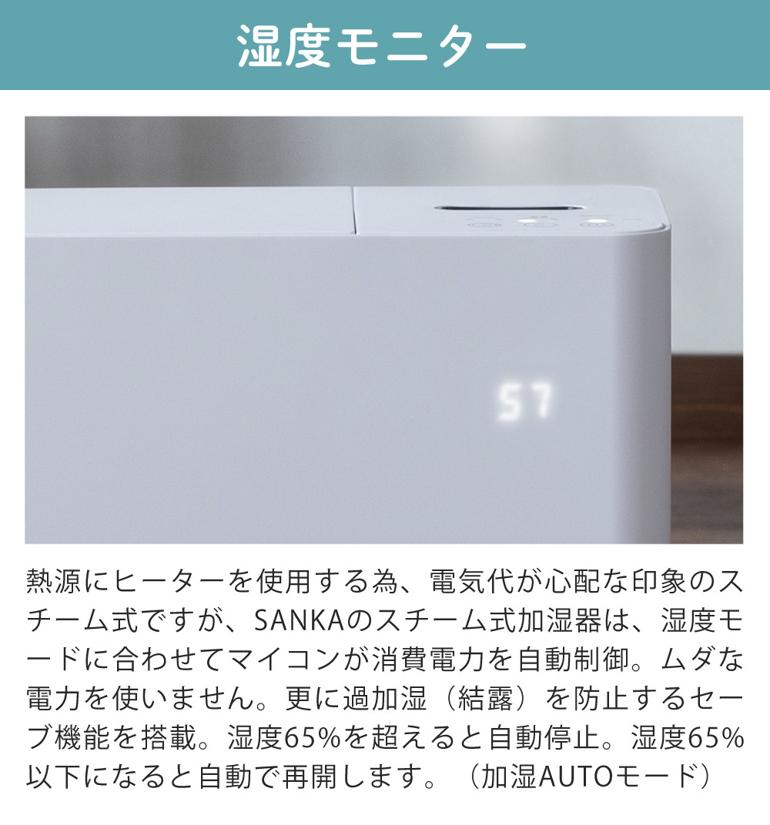 SANKAのスチーム式加湿器は、湿度モードに合わせてマイコンが消費電力を自動制御。