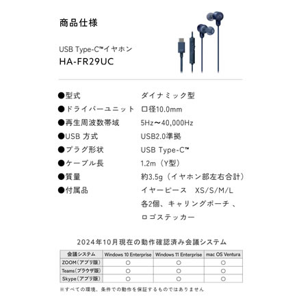 | その他詳細 2 | 【型式】 ダイナミック型 【ドライバーユニット】 口径10.0mm 【再生周波数帯域】 5Hz-40,000Hz 【USB 方式】 USB2.0準拠 【プラグ形状】 USB Type-C 【ケーブル長】 1.2m(Y型) 【質量】 約3.5g(イヤホン部左右合計) 【付属品】 イヤーピース XS/S/M/L 各2個、キャリングポーチ 、ロゴステッカー |