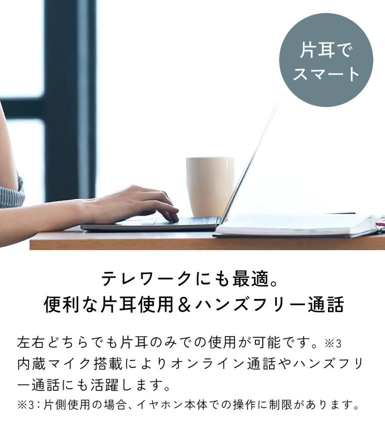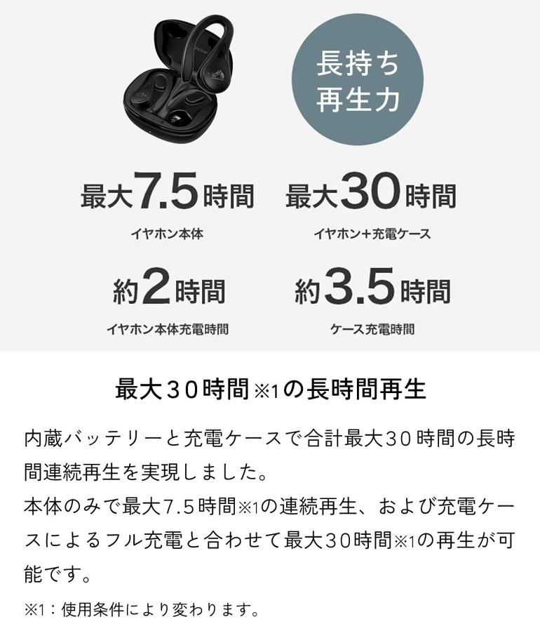 | その他詳細 6 | 電池持続時間※1 :イヤホン:最大7.5時間、充電ケース:最大22.5時間(計:最大30時間) |