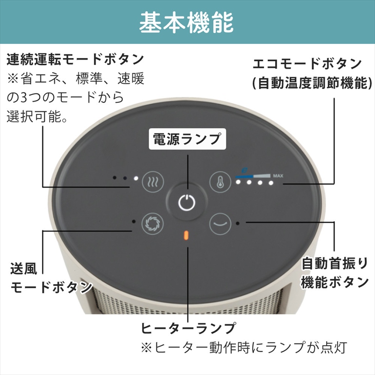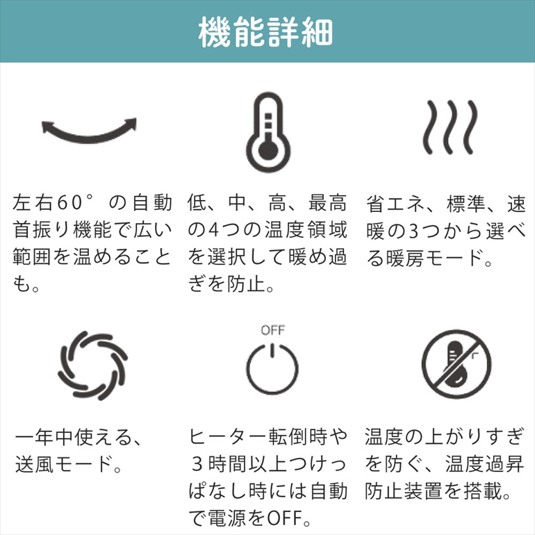 | その他詳細 1 | 暖房目安※:コンクリート住宅:断熱材なし断熱材50㎜約4畳まで約7畳まで。 木造住宅:断熱材なし断熱材50㎜約3畳まで約4.5畳まで。 ※暖房の適用床面積の目安は、一般財団法人日本電機工業会の統一基準による。室内外湿度15℃以下の地区で、1畳=1.65㎡ として(50Hzを基準)算出。 |