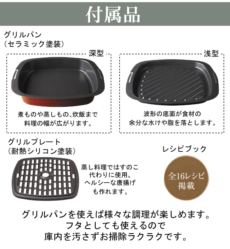 | その他詳細 3 | 付属品:グリルパン(セラミック塗装)、グリルプレート(耐熱シリコン塗装)、レシピブック |