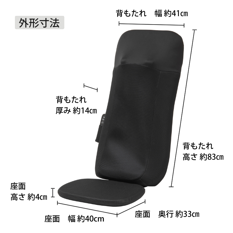 | サイズ/寸法 | 背もたれ:(約)幅41×奥行83×高さ 約14cm 座面:(約)幅40×奥行33×高さ4cm 電源コード長さ:約2m |