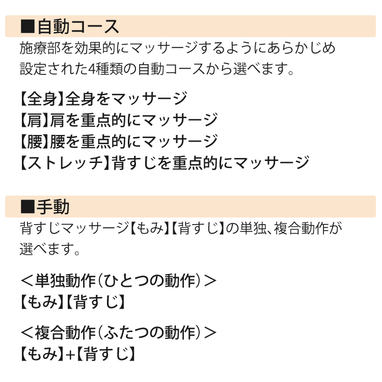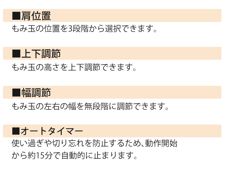 | その他詳細 2 | 定格:AC100V 50/60Hz 40W ACアダプター:IVP2400-1500P 定格時間:20分 オートタイマー:約15分 もみ回数:約13回/分 背すじ移動速さ(往復):約125秒 背すじ移動距離 最長:約64cm 付属品:ACアダプター 電気代の目安(月):約18円(1日30分使用)電力料金目安単価31円/kWh(税込)で計算(メーカー調べ) |