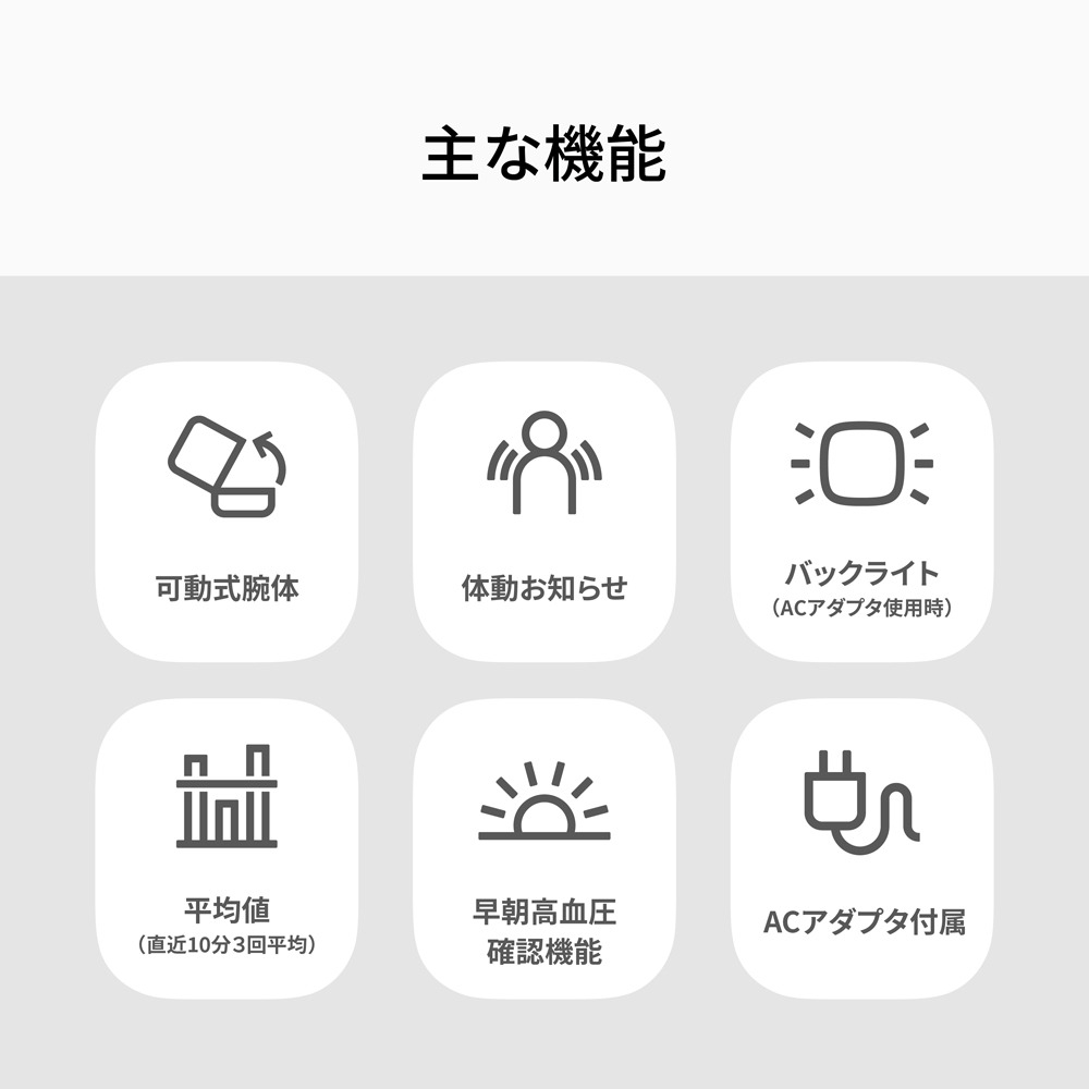 | その他詳細 1 | 【仕様】 ●電源:単3形アルカリ乾電池×4個/ACアダプタ(付属) ●付属品:専用ACアダプタ、取扱説明書(品質保証書付き)、医療機器添付文書、お試し用電池(単3形アルカリ乾電池4個) ●電池寿命:約250回(単3アルカリ乾電池使用時、当社試験条件による) ●その他の特徴: ・対象腕周/17~32cm(上腕中央部) ・メモリ(記憶機能) 2人×84回(ゲストモード付) |
