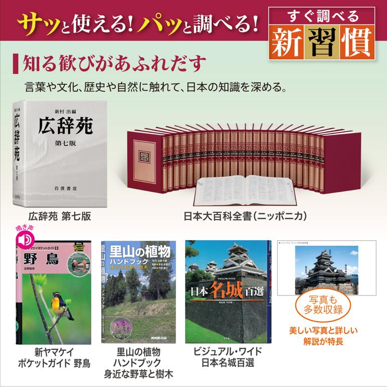 | その他詳細 2 | 【国語系】 広辞苑 第七版/ 明鏡国語辞典 第三版/ 新漢語林 第二版/ 現代カタカナ語辞典/ 新全訳古語辞典/ 明鏡 ことわざ成句使い方辞典/ 大修館 四字熟語辞典/ 楷行草 筆順字典 |