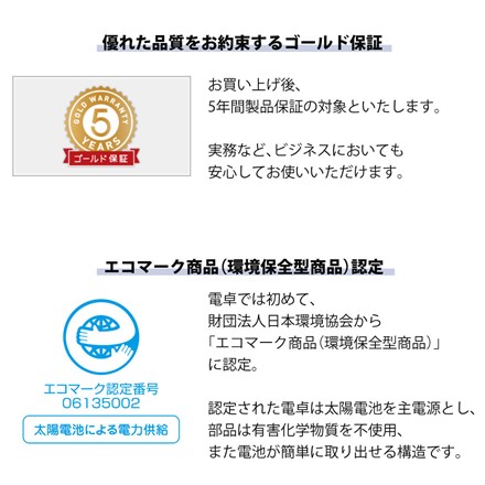 | その他詳細 2 | 製品特長: 日数計算機能 時間計算機能 税計算(税額計算や税率の変更可能) 傾斜表示 大型ストッパー 5年間のゴールド(製品)保証 エコマーク商品 桁数: 12桁 キーの特徴: 人間工学階段キー 数字が消えない2色成型樹脂キー(一部キーを除く) 凹凸キー タッチ音が静かなサイレントタッチキー メモリー: メモリー数 2 総合計(グランドトータル計算) 独立メモリー(M+、M-、MR、MCキー方式) |